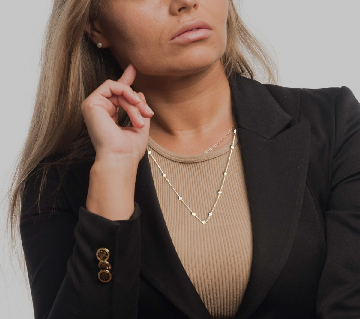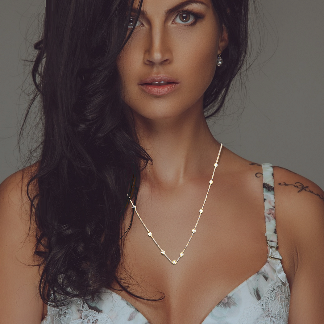 This ladies opulent necklace features 1.54 carat total weight of glimmering round brilliant cut diamonds. unequally scattered and set within secure rubover settings.