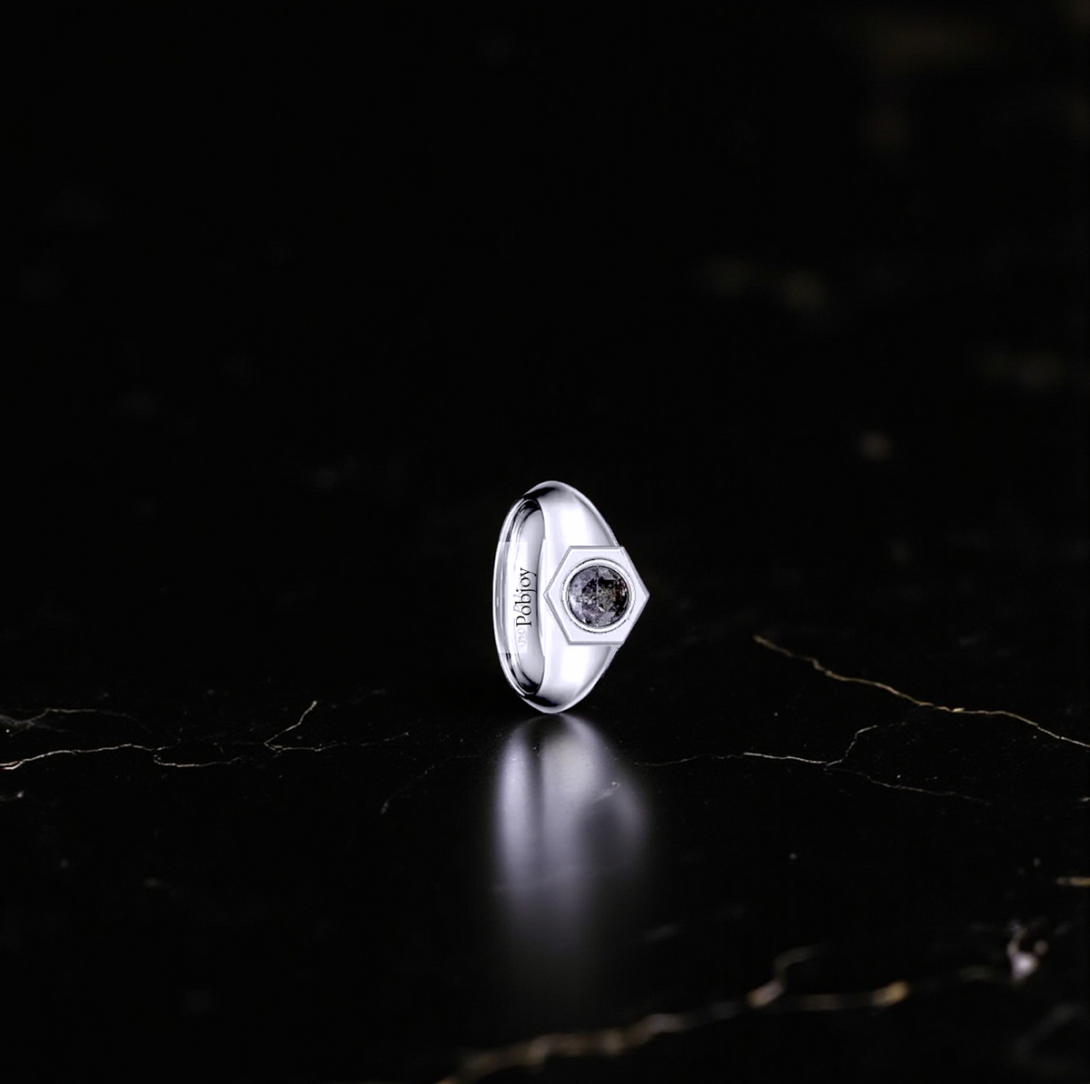 Understated original design. Smooth curves and domed profile juxtaposed with a hexagonal raised setting.