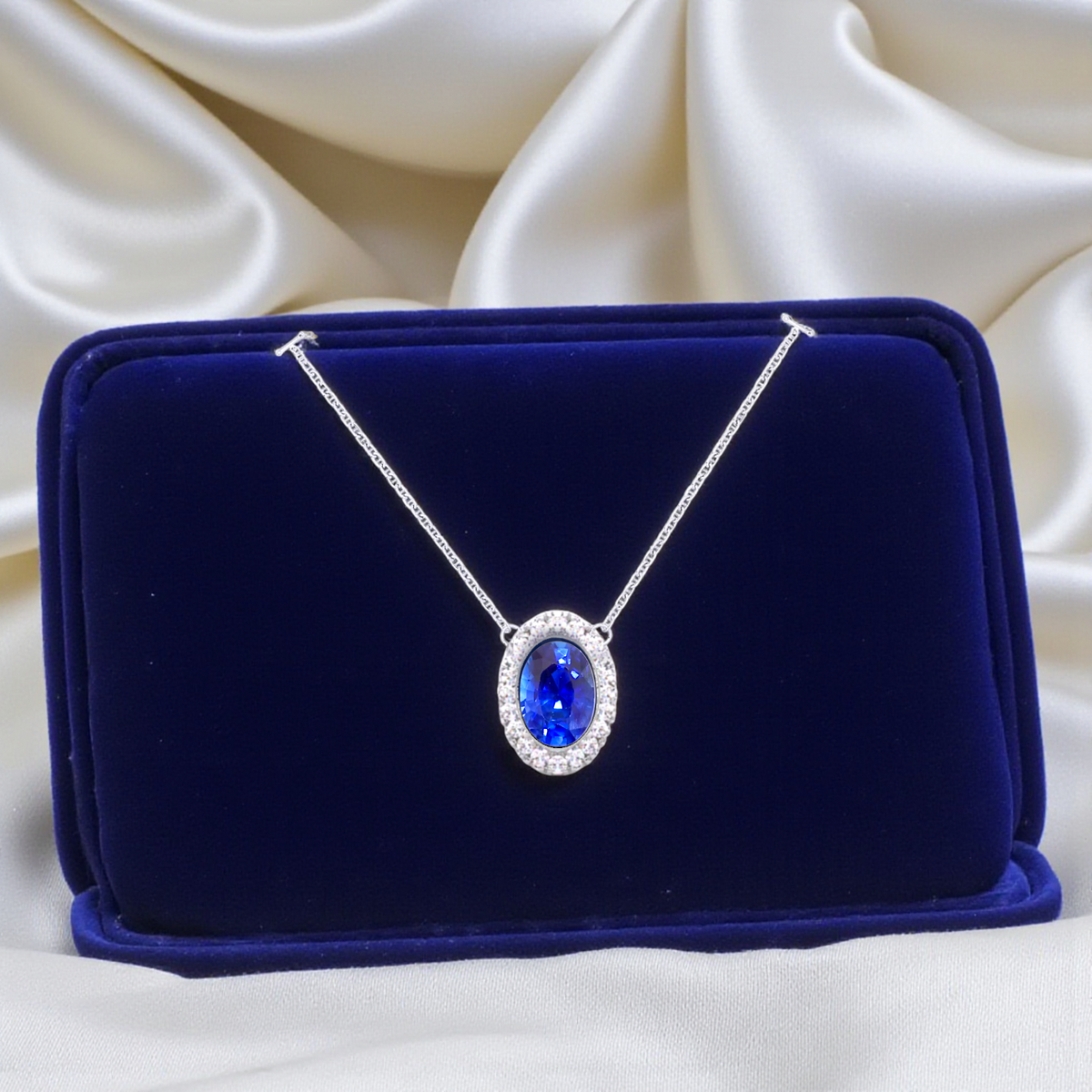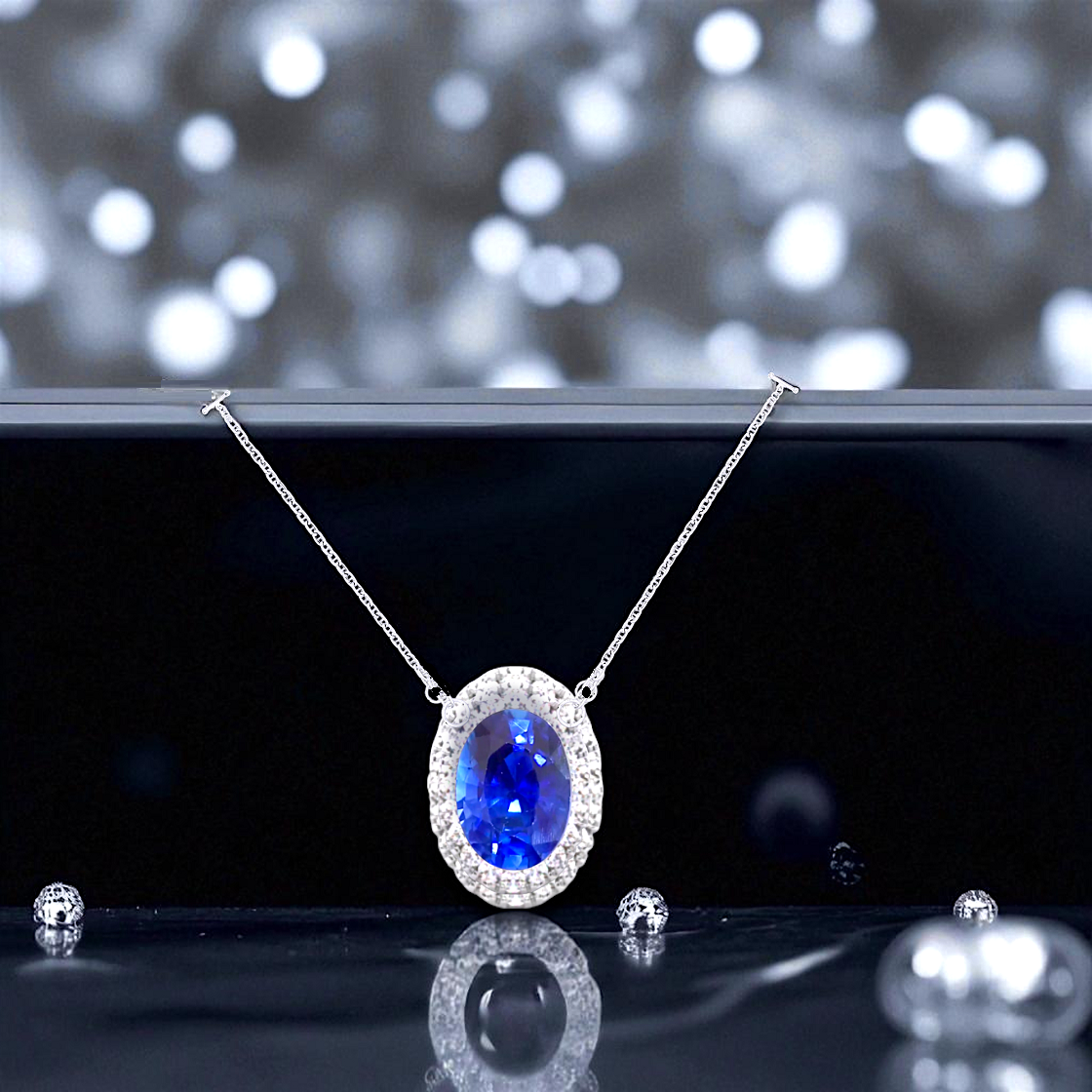 Oval Medium Blue Sapphire & Diamond Necklace 1.86 Carats