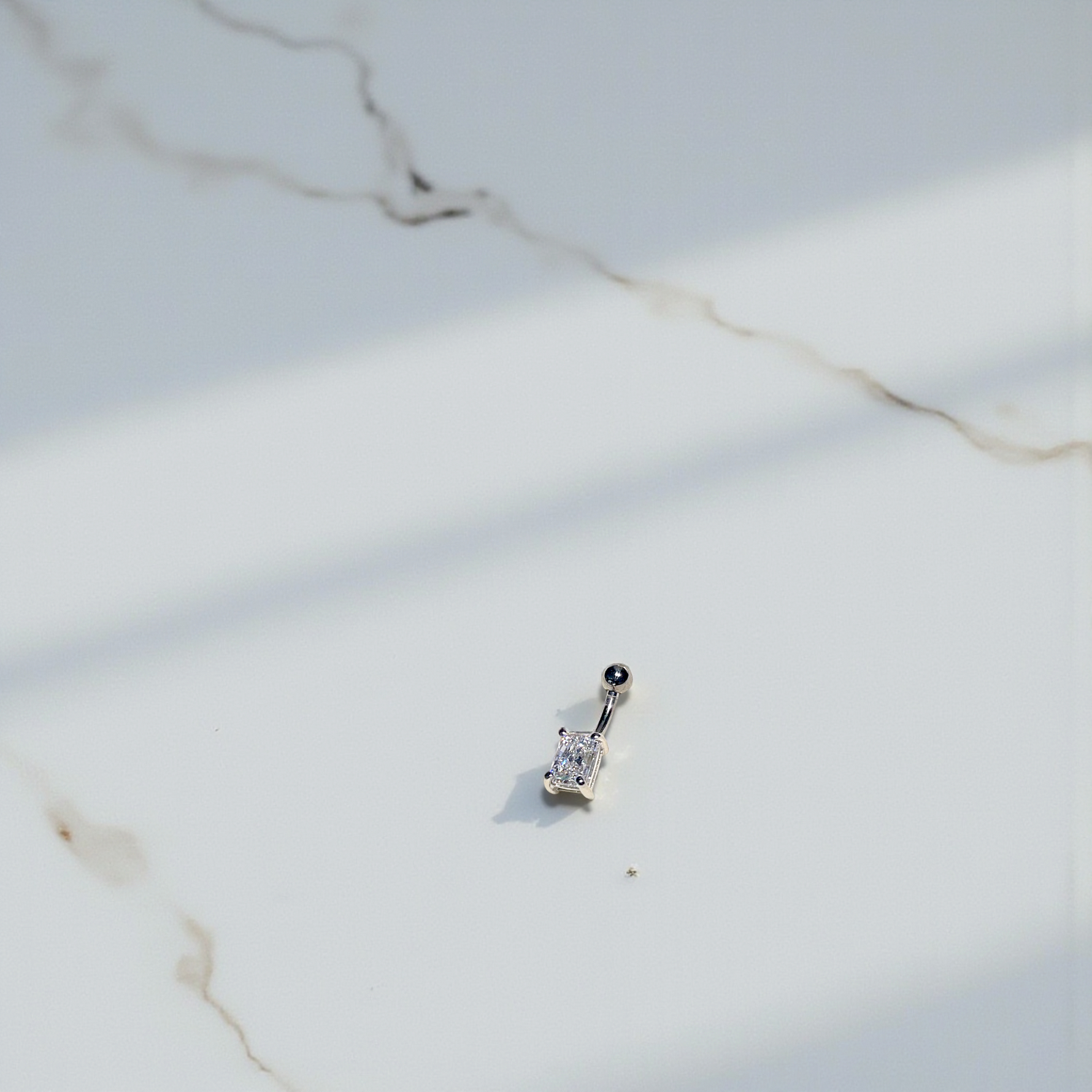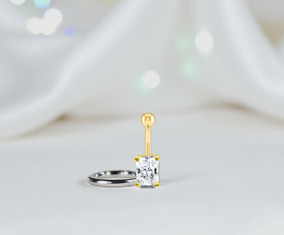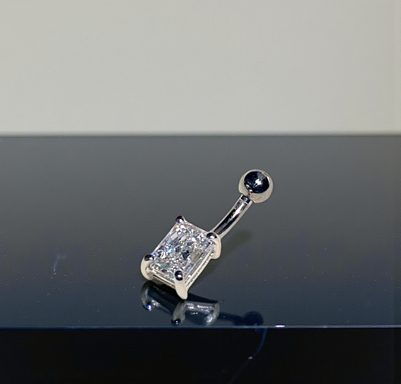 Unit price perSolitaire radiant cut lab diamond belly ring/belly bar in choice of platinum or 18K gold.
