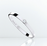 Featuring a 0.75 carat scintillating practically flawless round brilliant cut lab diamond. Set within a raised bezel atop a hinged solid sterling silver 6mm wide bangle.