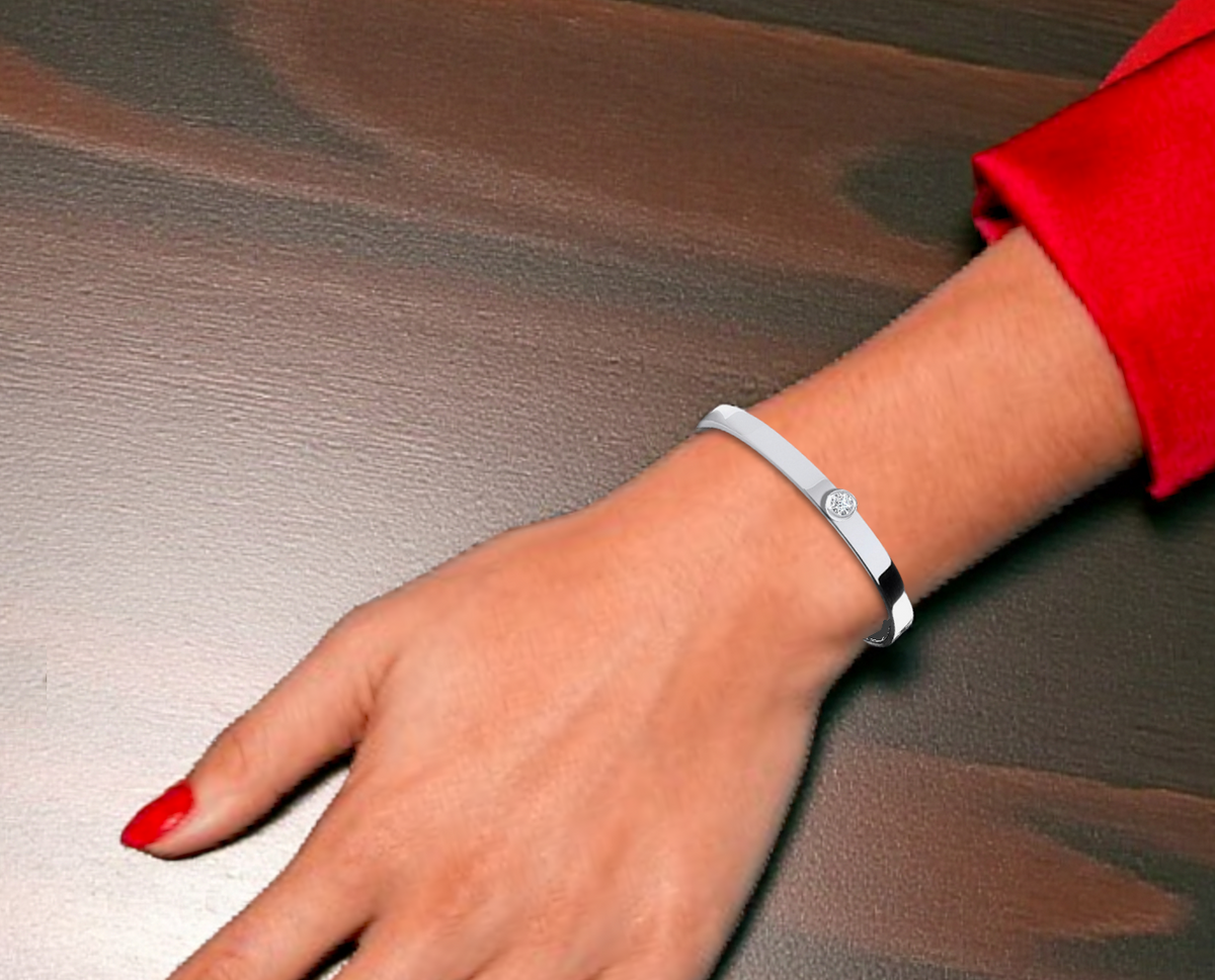 Solid sterling silver handmade hinged bangle with donut set solitaire lab grown diamond.